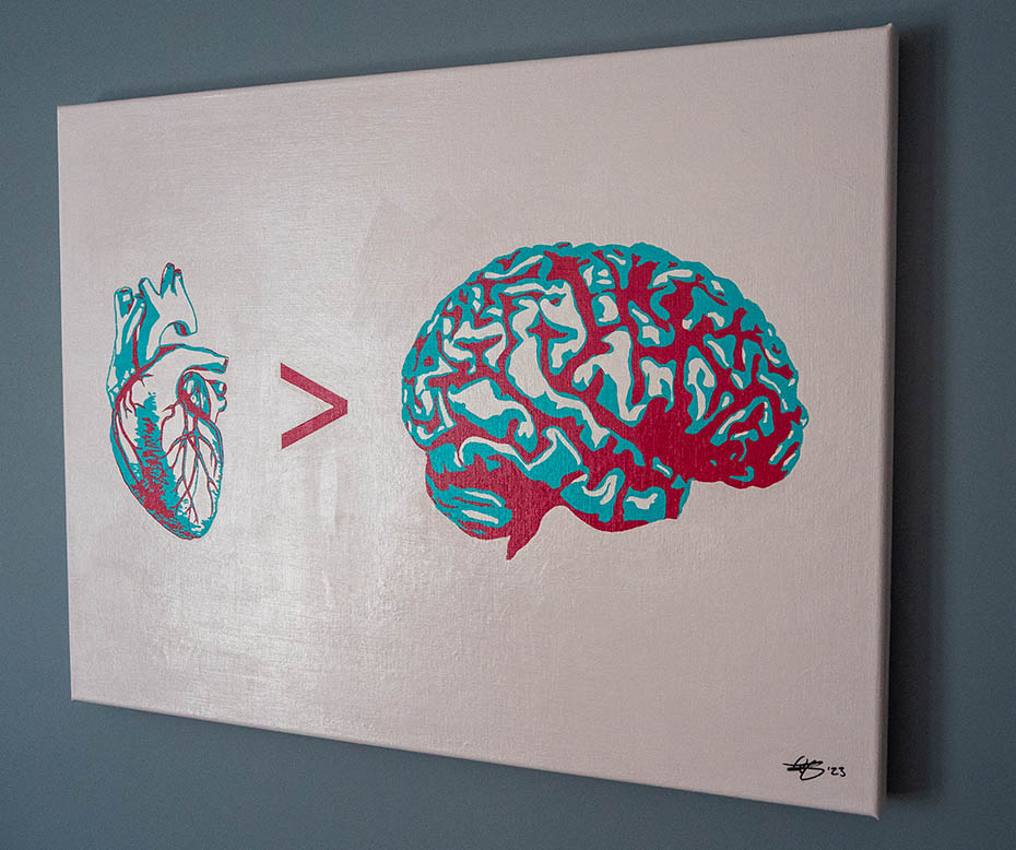 Love is a neurobiological phenomenon that relies on trust, pleasure, belief, and reward activities wihtin the brain (especially the limbic system). The feeling of love is related to the release of various neurotransmitters, such as oxytocin, dopamine, serotonin and endorphin (endogenous morphine). Hence, love has a stress-reducing and health-promoting effect. Therefore, we cannot live without love. However, the question is: do we love with our brain or with our heart? Sometimes we really like someone and cannot get them out of our head. Love is irrational, but is often rationalized. This art series reflects my search for love and how love relates to the brain and heart.
